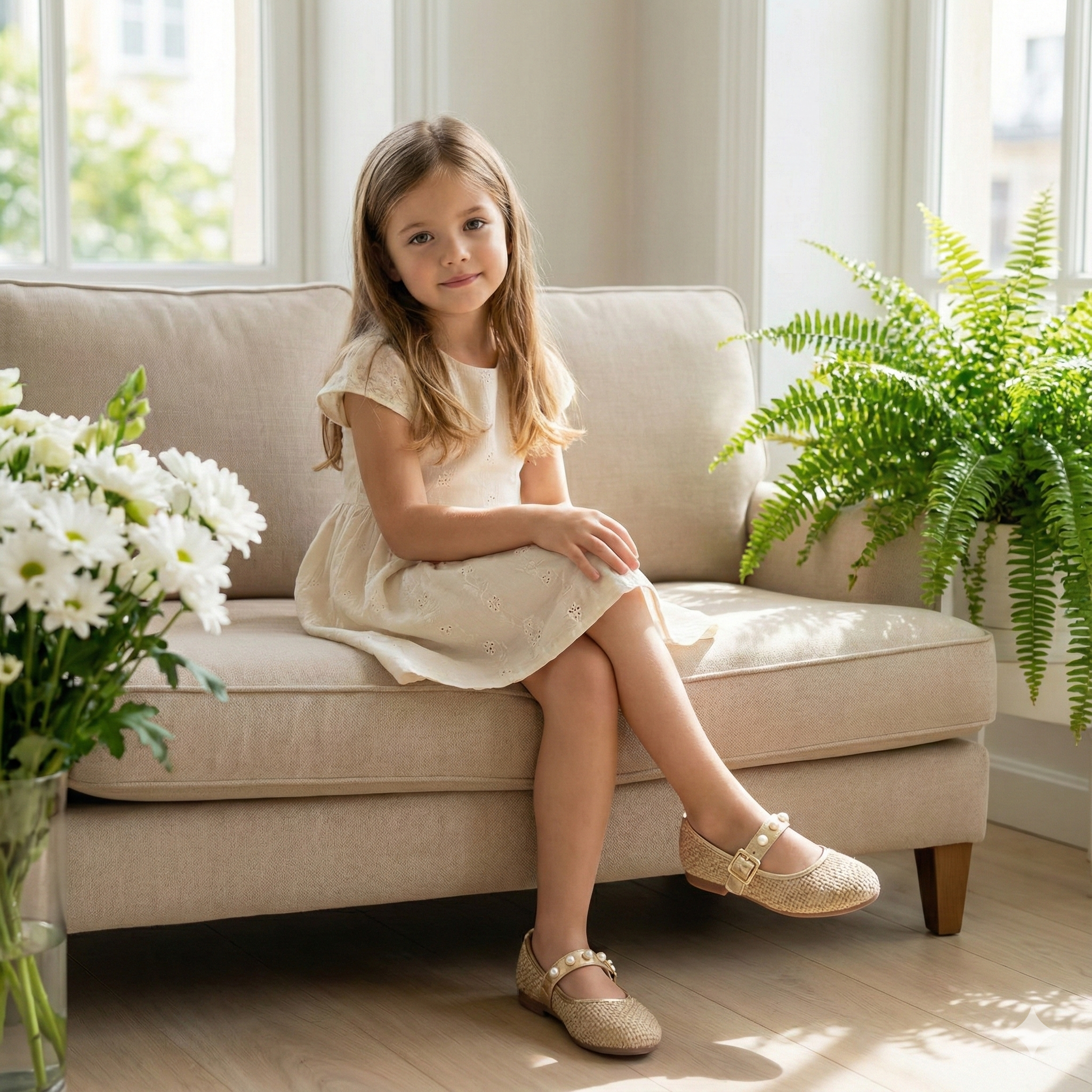 El protagonista es su hermosa capellada en Yute tejido, que aporta una textura natural, fresca y artesanal única. Este toque rústico se equilibra magistralmente con un ribete y una correa en dorado metalizado, finalizando con el detalle más dulce: tres delicadas perlas en el empeine que harán que tu niña se sienta en un cuento de hadas moderno.