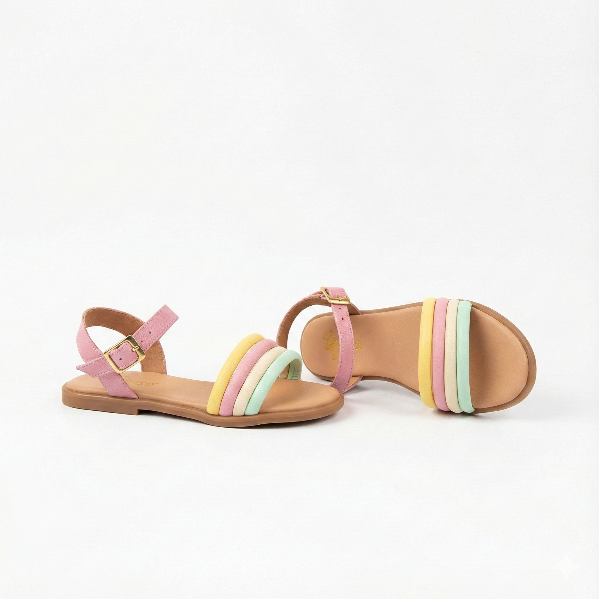 Las sandalias "Brisa Primaveral" son un soplo de aire fresco para el vestuario de cualquier niña. Su diseño, inspirado en los dulces tonos de la primavera, combina la tranquilidad del verde menta, la suavidad del rosa y el toque sereno del celeste, como si cada paso fuera a través de un jardín floreciente.